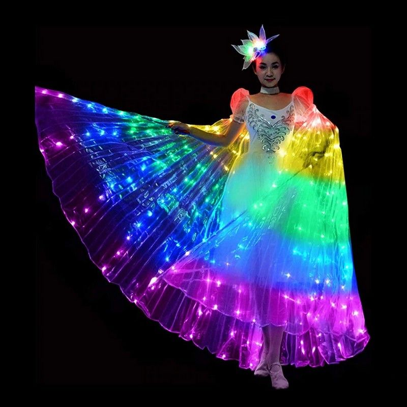 Made for the bold and radiant these wings explode with cascade of multicolour light as you move, turning every step into a celestial spectacle. Flowing fabric meets electric fire — embrace a fusion of elegance and energy at your next rave or festival.