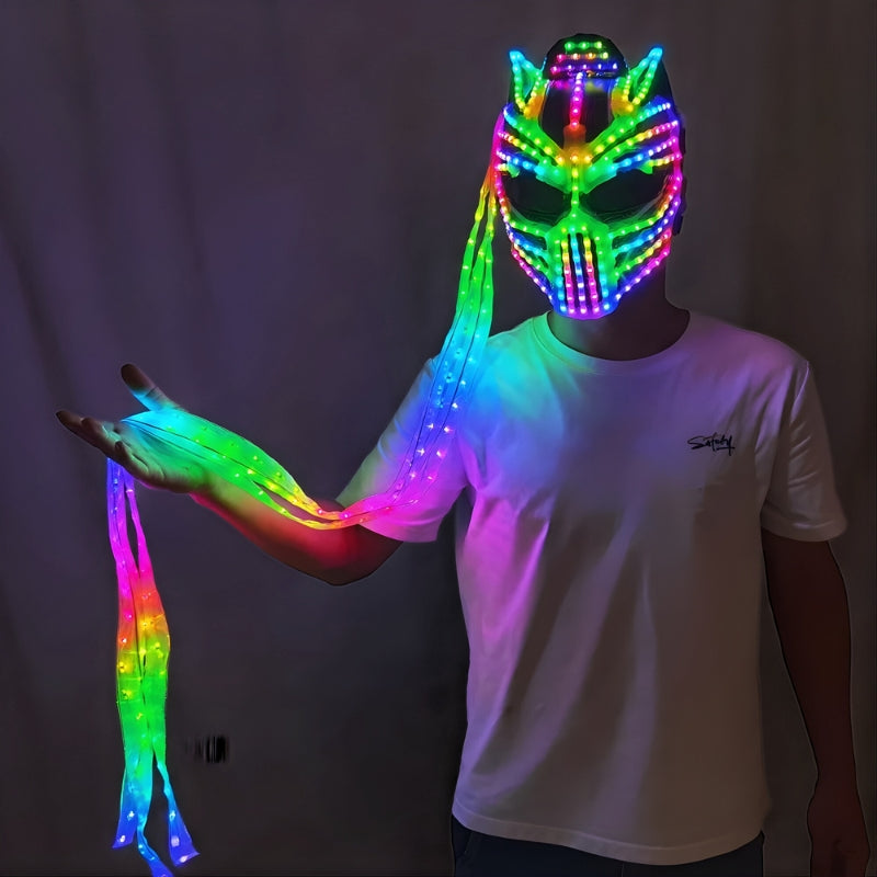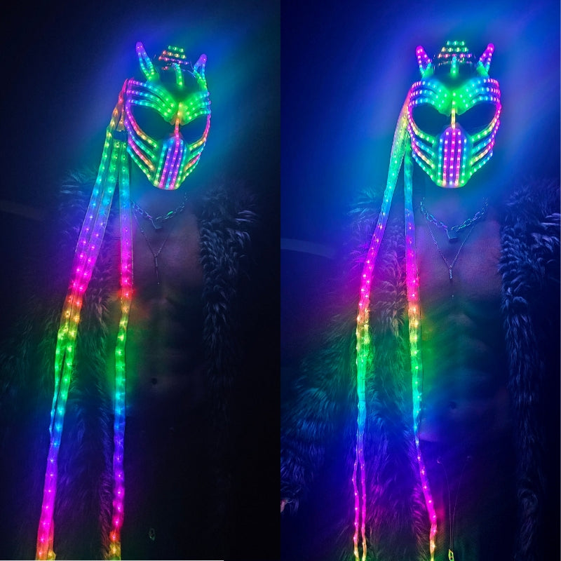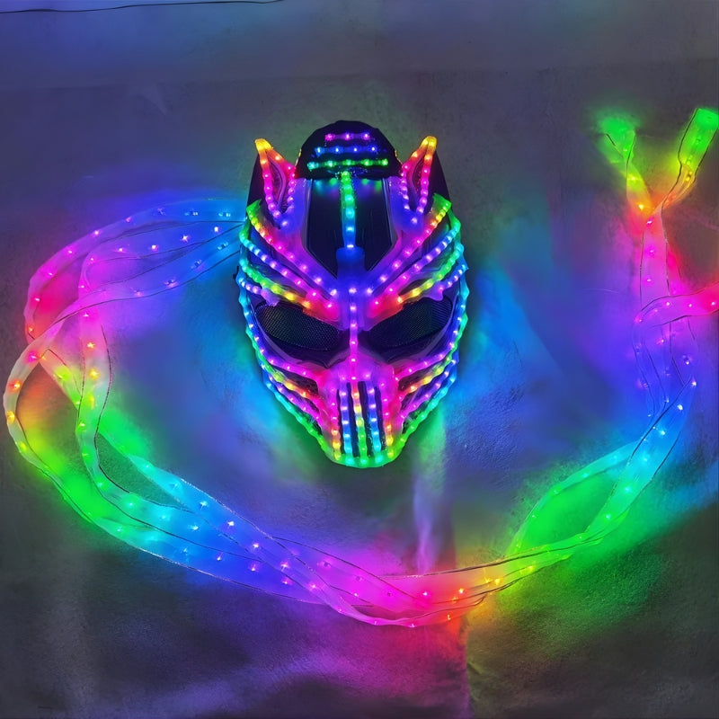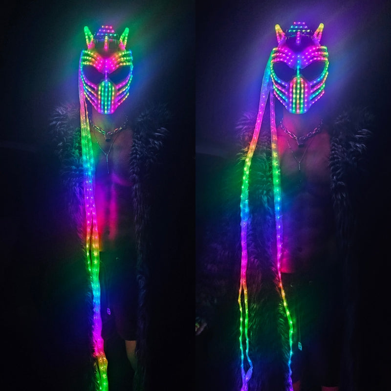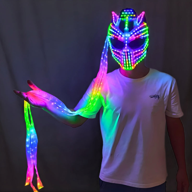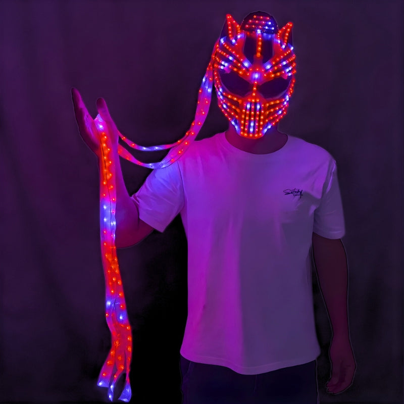 Unleash apex energy on the dance floor with our Euphorium's Exclusive Neon Predator LED Mask - a next-level statement piece built for serious festival performers and ravers. Designed with an aggressive, futuristic silhouette and three plasma appendages that extend below the knee, this mask delivers unmatched movement, presence and visual impact.
