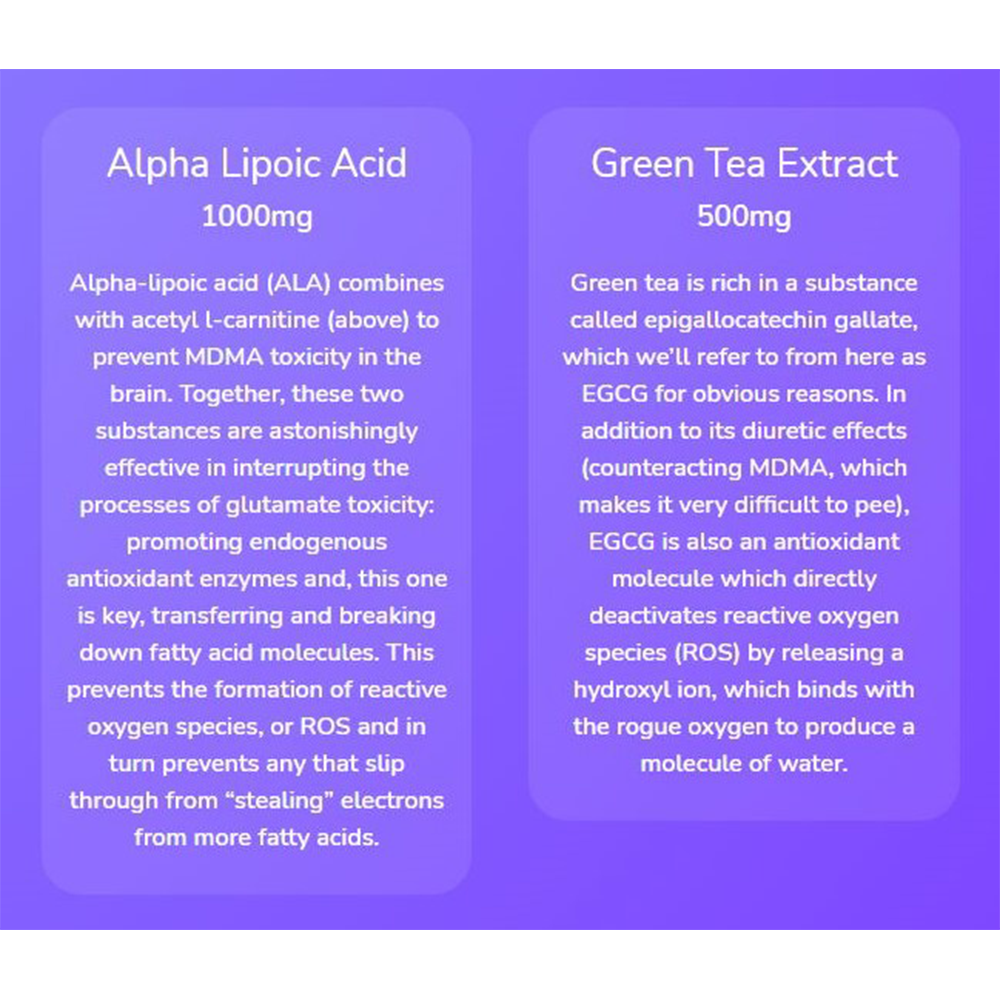 Long nights and elevated states come at a cost—but with RaverRX, you don’t have to pay the full price. Formulated specifically for ravers, this supplement is your go-to recovery ally—designed to support your body and brain before, during, and after the party. Packed with science backed neuroprotective ingredients, antioxidants, and key vitamins, RaverRX helps support energy levels, reduce oxidative stress, and ease the dreaded comedown to foster a restorative sleep.