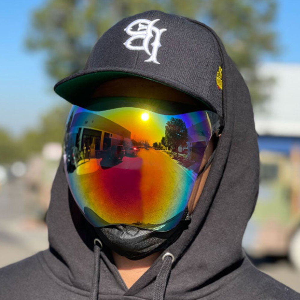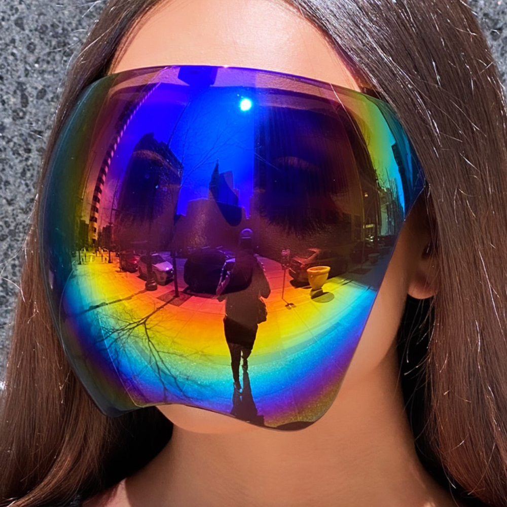 Embrace the total visual domination - a sleek, futuristic visor that consumes your entire gaze, blocking out distractions and plunging you headfirst into the electrifying energy of the night. Embrace the speed at your next rave or festival.